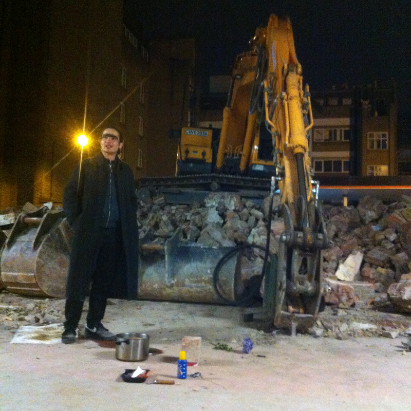 Hot historical - Gardenia stem, rib eye steak, factor 50 sun tan lotion, 2kg durian fruit in pot, cuboid pink marble, knife.