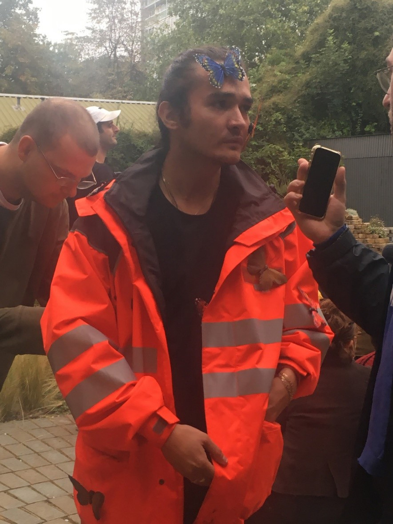 During performance I wore costume: A postman on his day off, 2018 - decommissioned postman jacket, painted garden butterflies, circle velcro, shorts, crocs, cigarette. Performed in the Orzco Garden water butt.